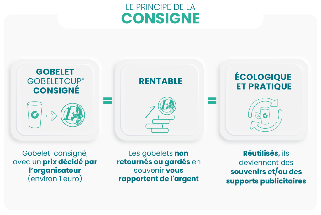 • Chaque gobelet GOBELETCUP® est consigné, avec un prix décidé par l’organisateur (environ 1 euro).